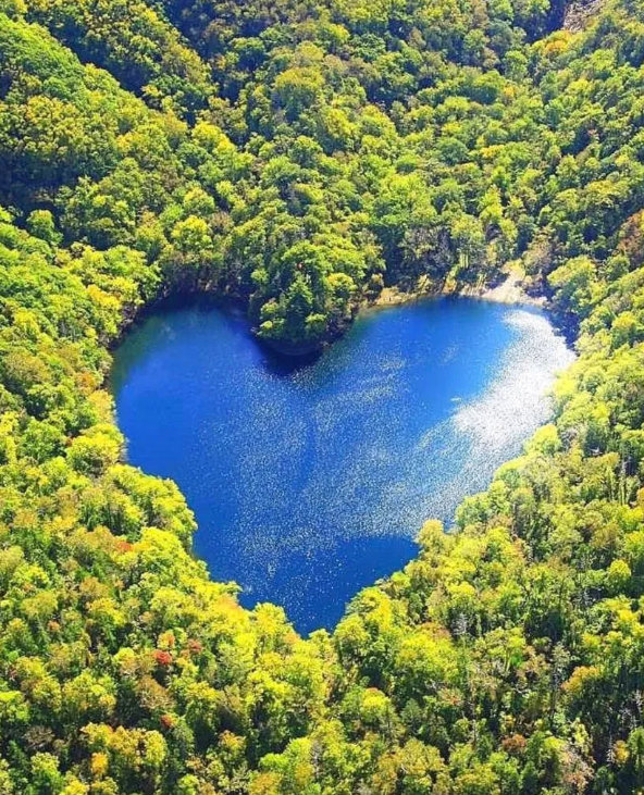 Explore the serene allure of heart-shaped lakes embraced by vibrant foliage-a majestic tribute to Mother Nature’s love
