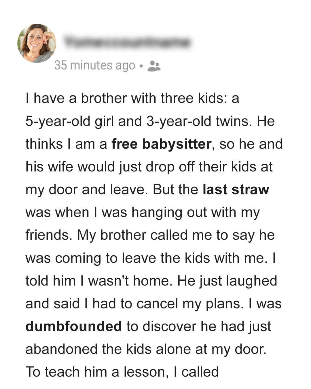 The woman said her brother, 27, was a father to three children, one five-year-old and three-year-old twins. However, whenever he needed a babysitter, he would assume his sister...