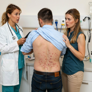 Discovering 30 red spots like insect eggs on my husband’s back, I rushed him to the emergency room. The doctor immediately looked at him and said urgently: “Call the police immediately.”