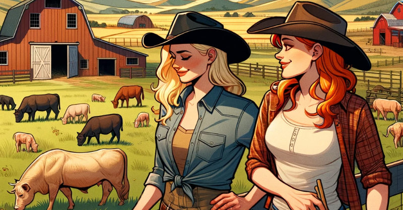 A blonde and a redhead have a ranch. They have just lost their bull